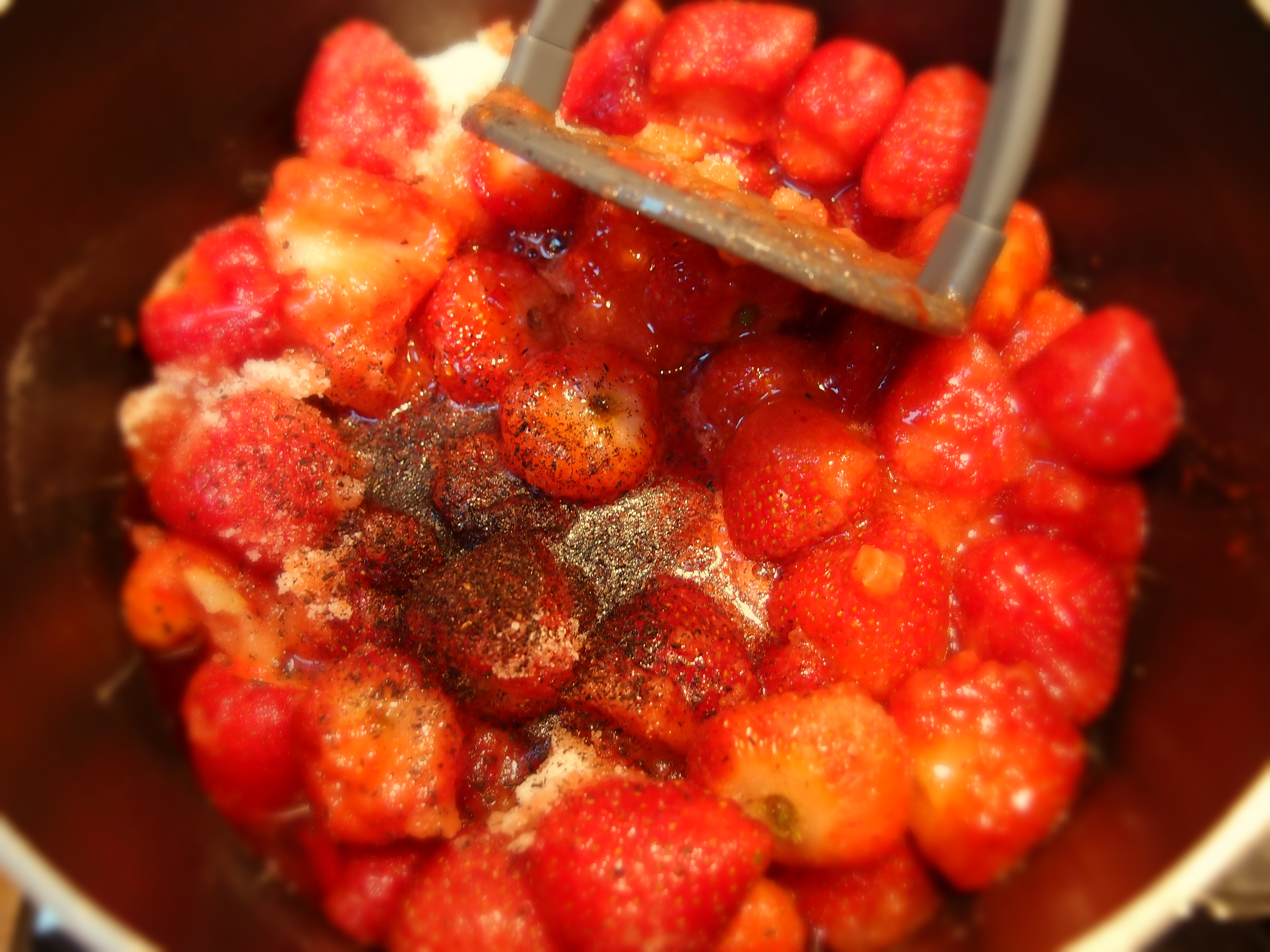 Step 3: Place the strawberries into a pot and place on medium heat (I found it easier to turn on the heat and wait for the strawberries to soften before mashing them). Add the sugar and vanilla. Wait for the strawberries to become mushy and mash them with the potato masher until it looks a bit like the below.