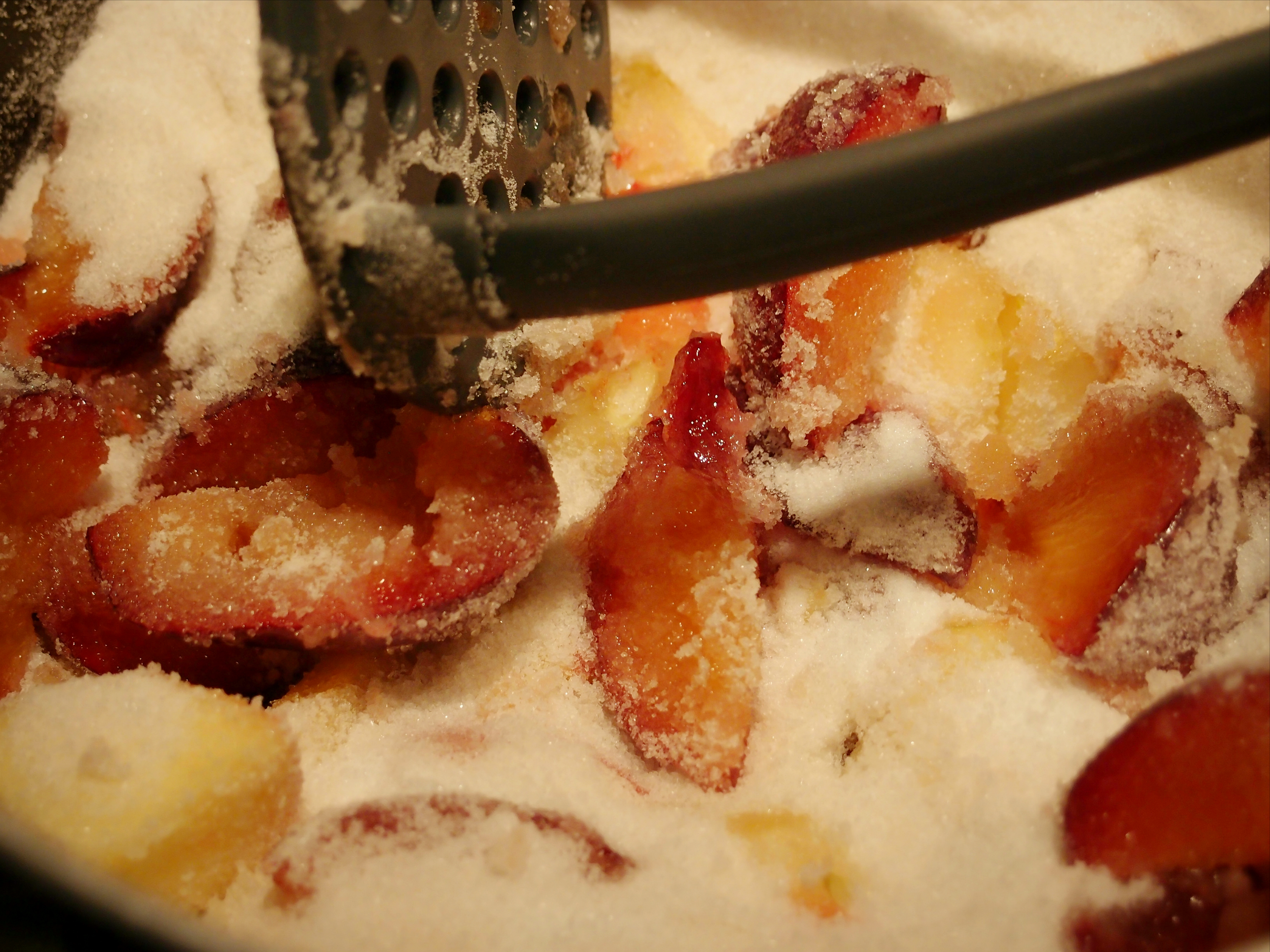 Apple_Plum_Jam_1 I scaled down the sugar slightly, as the apple and plum varieties already seemed quite sweet to me. By the original recipe, you should use 450g sugar. Also, just because I’m paranoid (and there was still some left over), I’m using a mix of jam sugar, which contains pectin, and normal sugar. In theory, the plum will provide enough natural pectin, so you can use normal white sugar here.