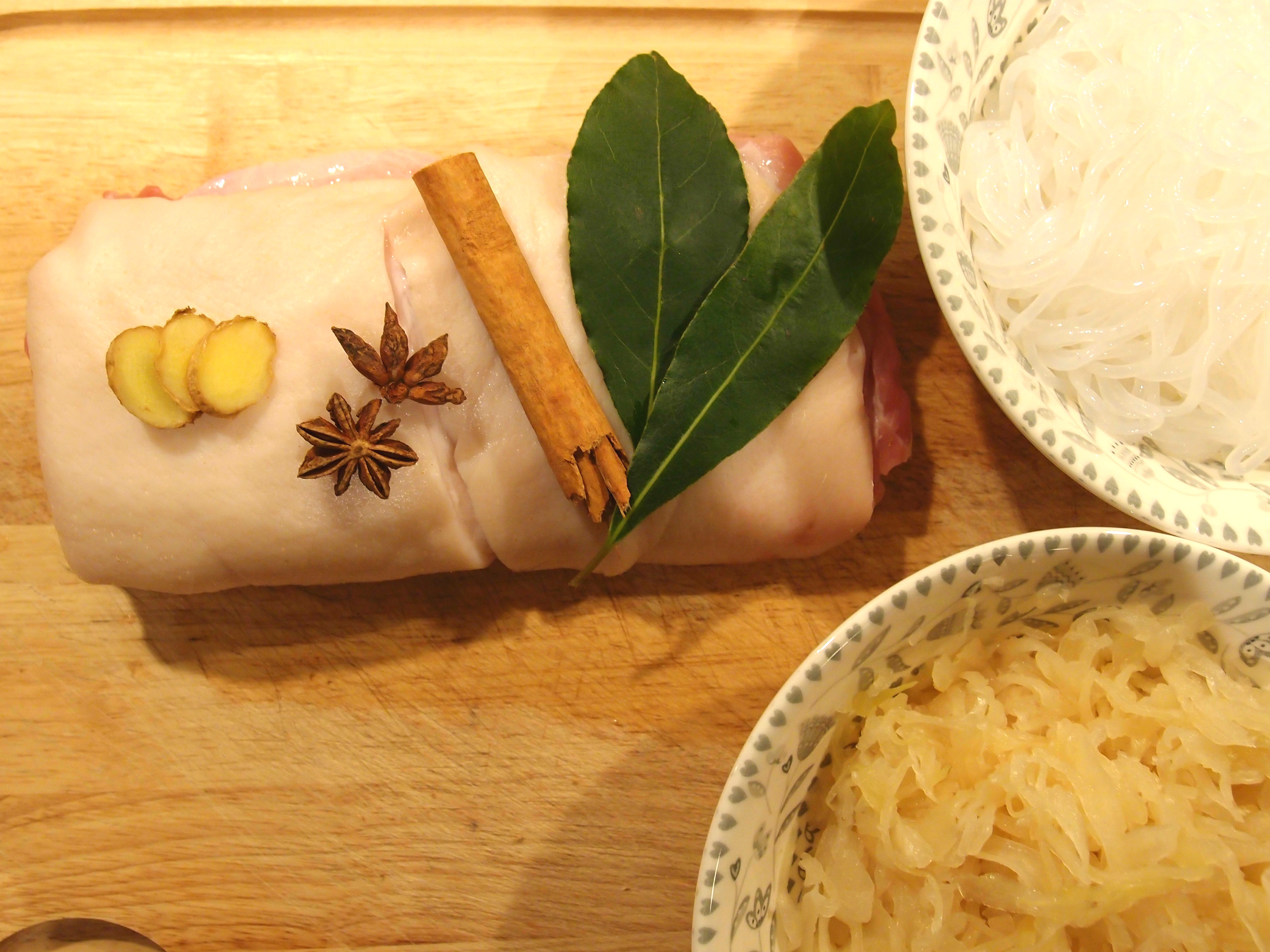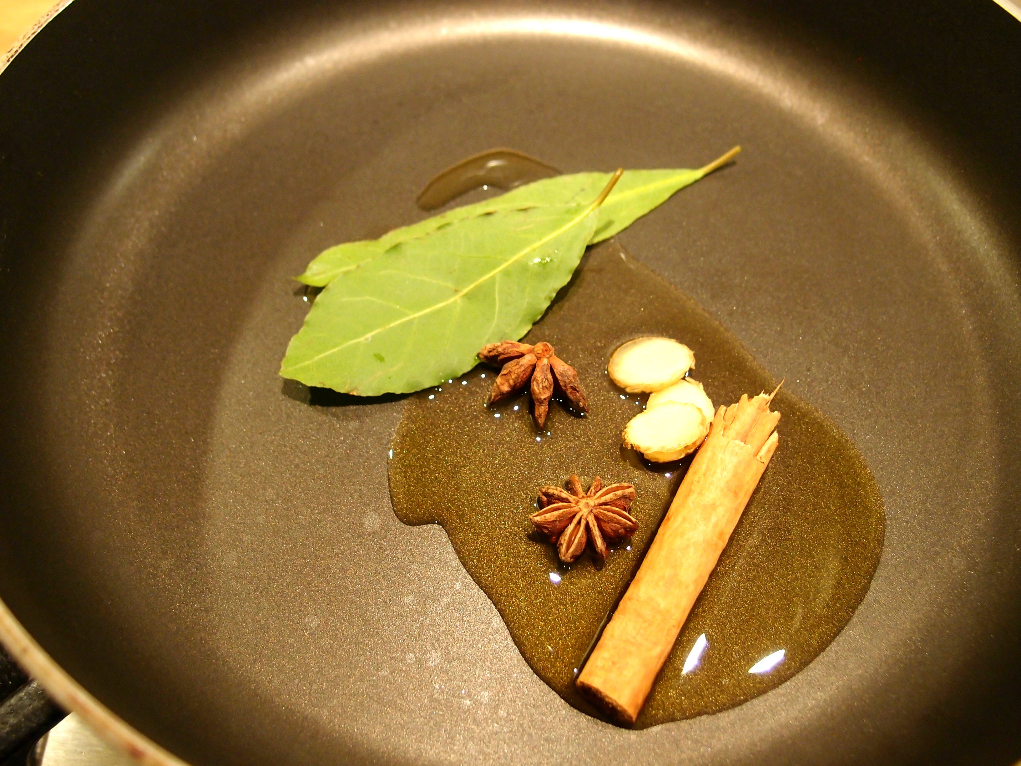 Step 2: add a dash of olive oil to a frying pan on medium heat. Once it starts to bubble, add in the cinnamon, bay leaves, star anise and ginger. Leave for 1 minute before adding the pork belly, then add a pinch of salt, stir and put the lid on the frying pan.