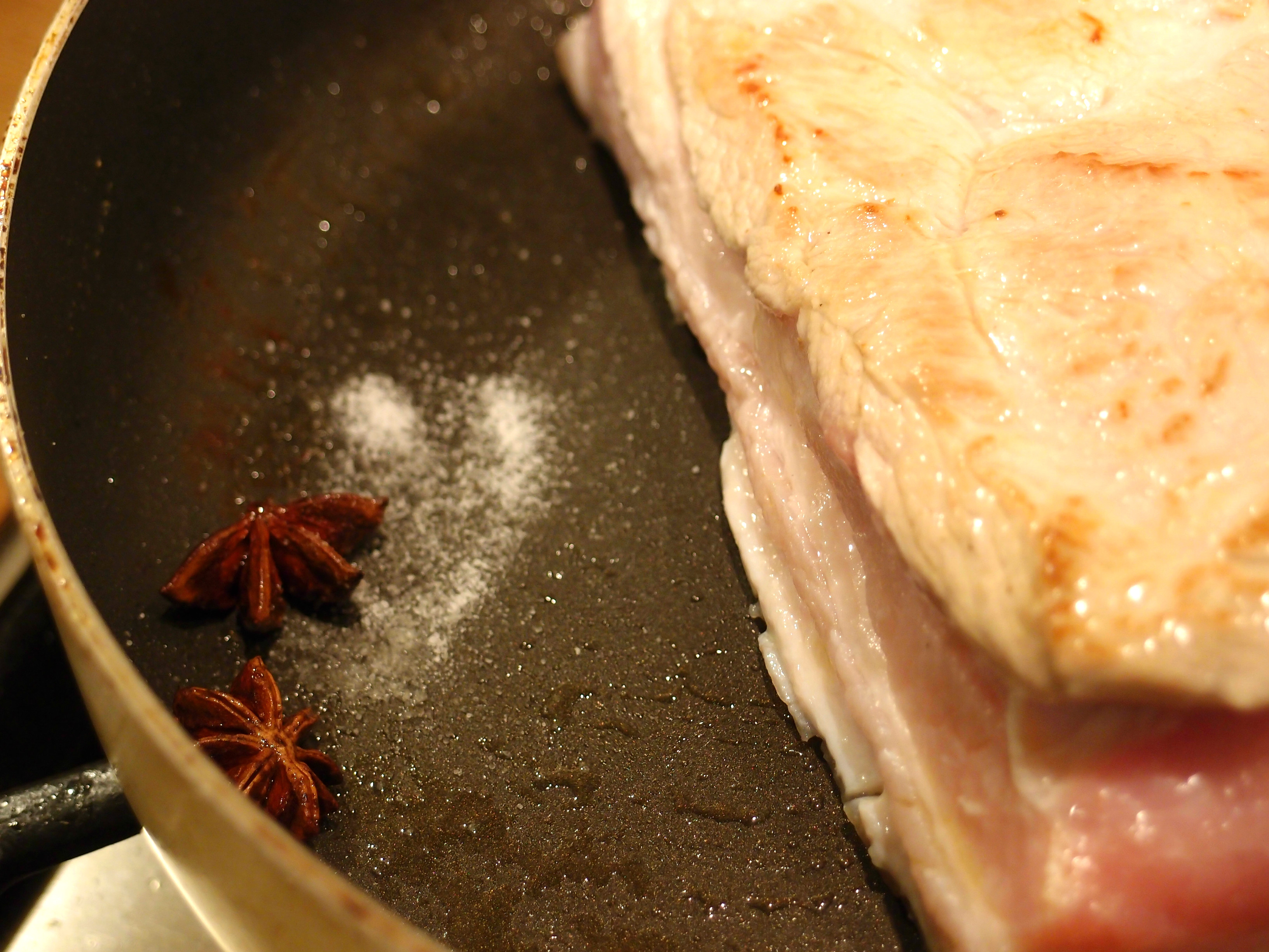 Step 3: switch to low heat once the skin half of the pork belly starts looking cooked (i.e. no longer very pink – but don’t worry about a touch of pink, as it will be cooked again once sliced). Turn over and cook for roughly 15 minutes on low heat. Turn again and cook for another 5 minutes. Check that the pork is soft.