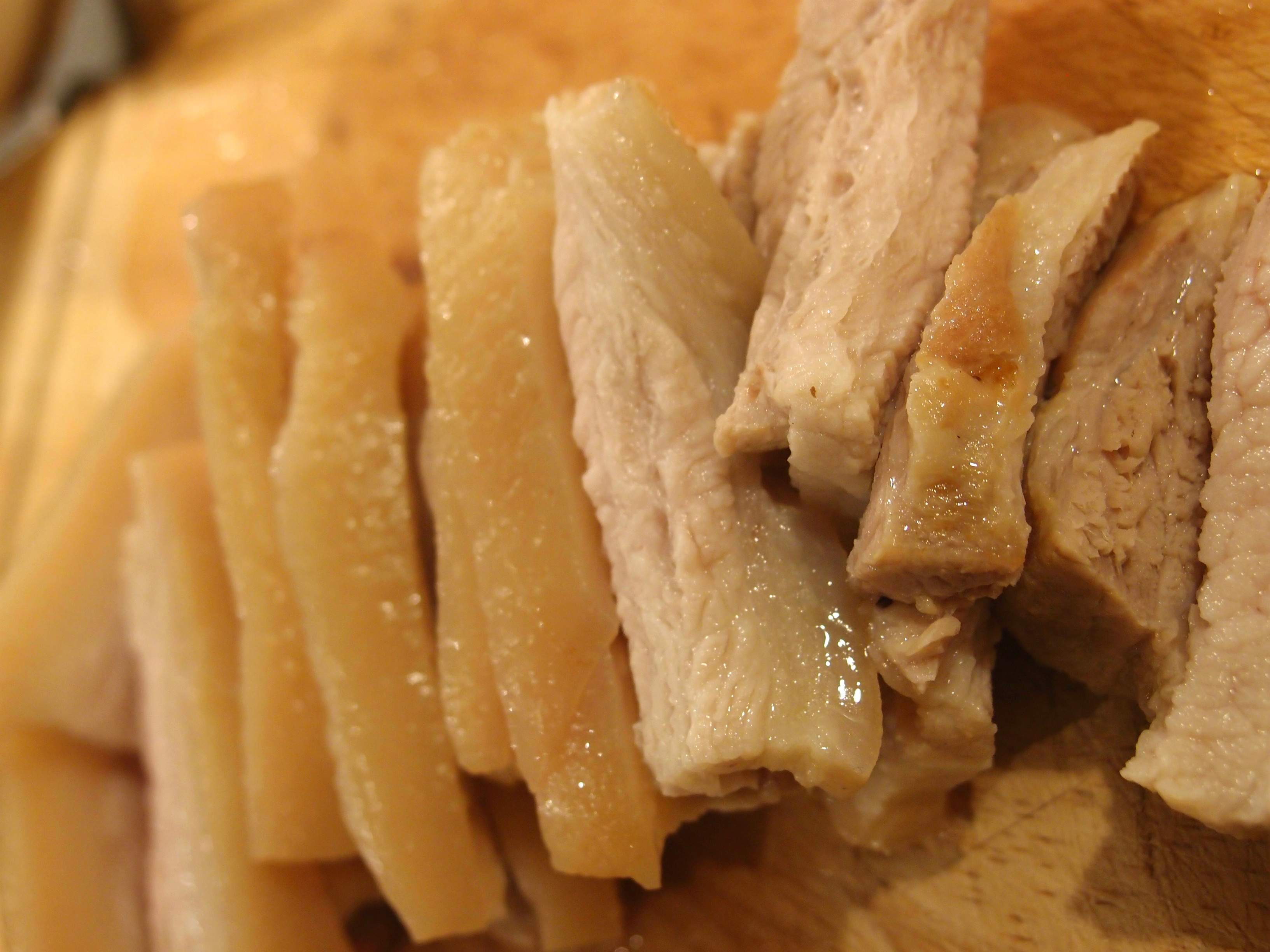 Step 4: remove the pork belly and (optional) place it on some oil-absorbing paper. Leave to cool for 5 minutes, then slice it into strips. If you’ve got the skin on, then you want cross-sections with the skin on top.