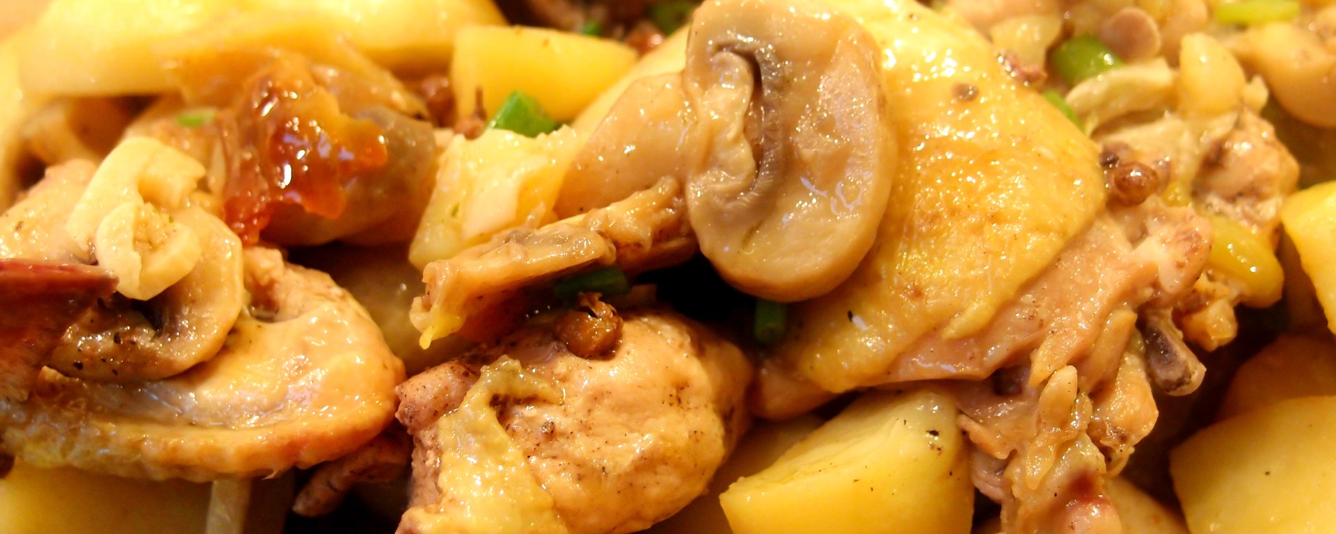 Step 1: peel and cut the potatoes so that each piece is smaller than the chicken pieces, slice the mushrooms/bell peppers, the ginger, garlic and chop the white sections of the spring onions to around 1 inch sections and chop the green parts more finely.