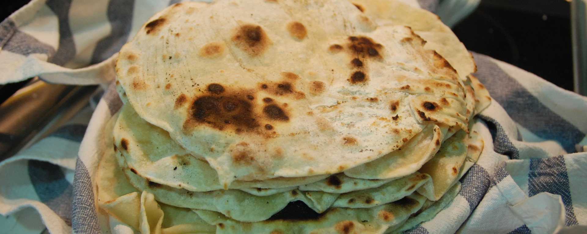 Step 5 – Place the pan on the stove at a medium-high heat. When the bottom of the pan is hot, place the first disc of dough on it. When the bread starts making bubbles, turn it to the other side. You should have a sense of when it’s cooked because it will start having dark spots where the bubbles have formed, you don’t want those to become burned. Place the flatbread in a tea towel to make sure it stays warm, and repeat the process until you cook all of them.