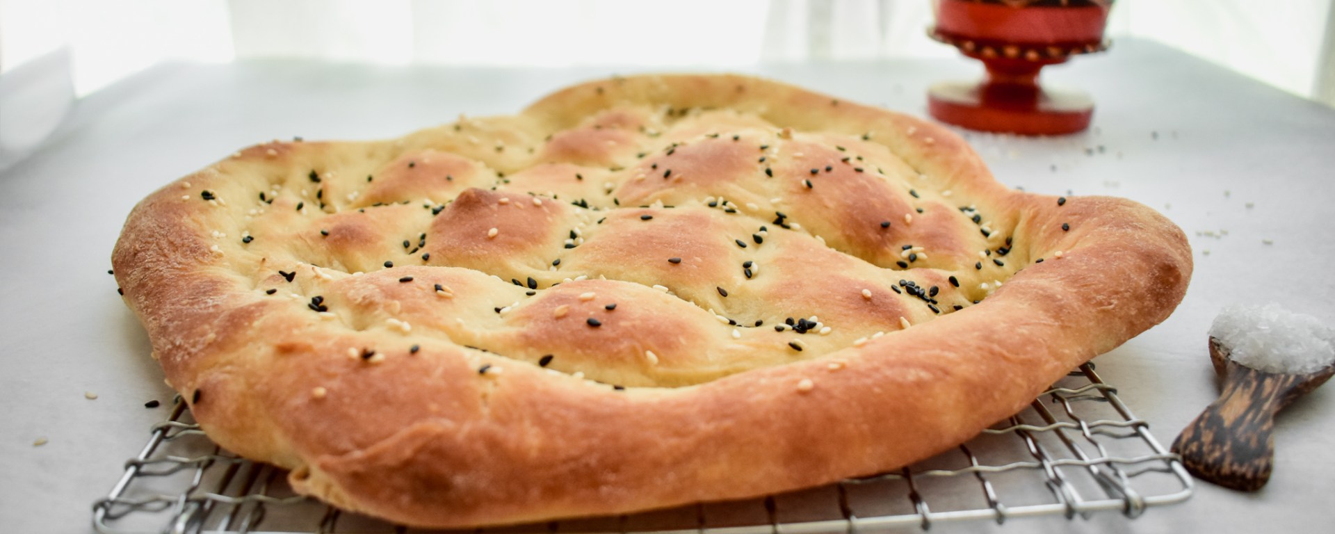 After so many features on my IG profile, it seems like a must that I share the recipe of this Super Easy Turkish Bread, or Pide. I’m adding it more as a journal entry, as the recipe is heavily inspired by the one by Lazy Cat Kitchen Blog. But I cannot help myself from posting it, as since we discovered it, it quickly became one of our bread staples. We made this Turkish bread for so many dinners, serving it with meze – for example it’s great with Hummus or Babaganush – with roasted meats and every time it’s a huge success. The best part is that this Turkish bread needs so little effort, and you can time the prepping for it to be ready when your guests arrive, so you can serve it warm with dinner.