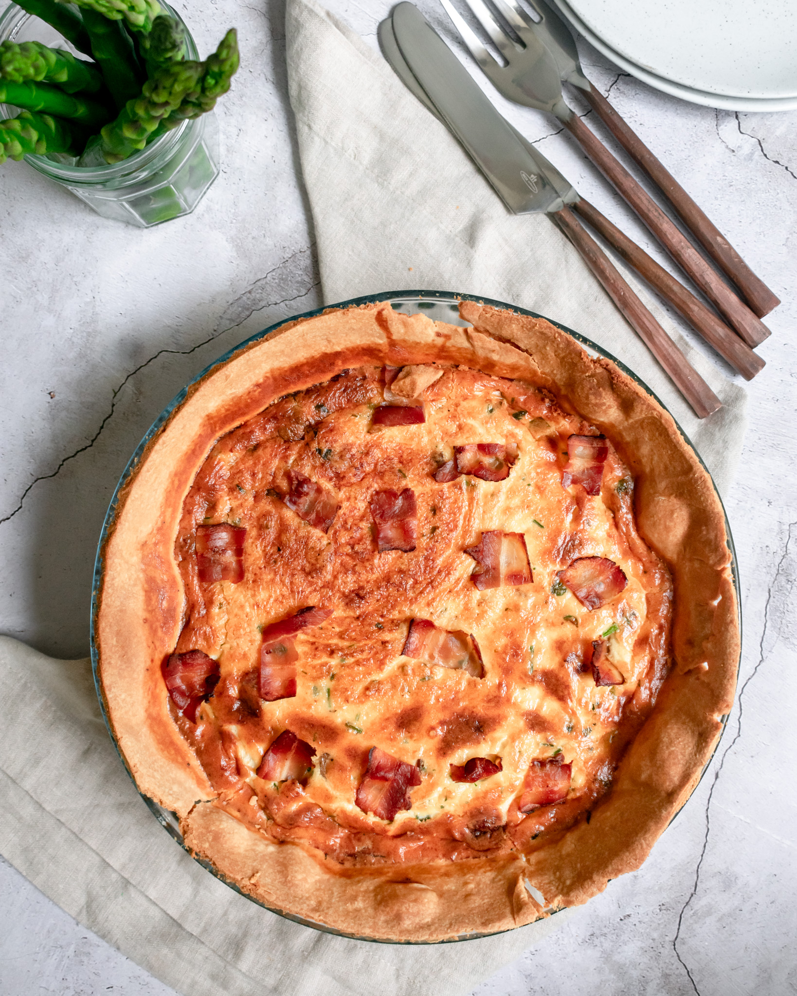 Posting this classic quiche Lorraine on IG was a major success. I was very surprised that a lot of people asked for the recipe. Thinking of it, while the French might have grown up making quiches, in Italy – where we called these “savoury tarts” – it’s a thing only in certain regions, and in many other countries they come ready from the supermarket. I still remember my first quiche was a Sainsbury’s one. The family I au-paired for on the Isle of Wight used to buy quiche Lorraine regularly. I’ll be honest – those ready made quiches are awesome and so good to have handy! You can easily get them in Singapore from M&S or NTUC. But once you learn a thing or two about pastry it feels actually very straightforward to make a fresh one at home too, so here comes the recipe I used in case you want to give it a go.
