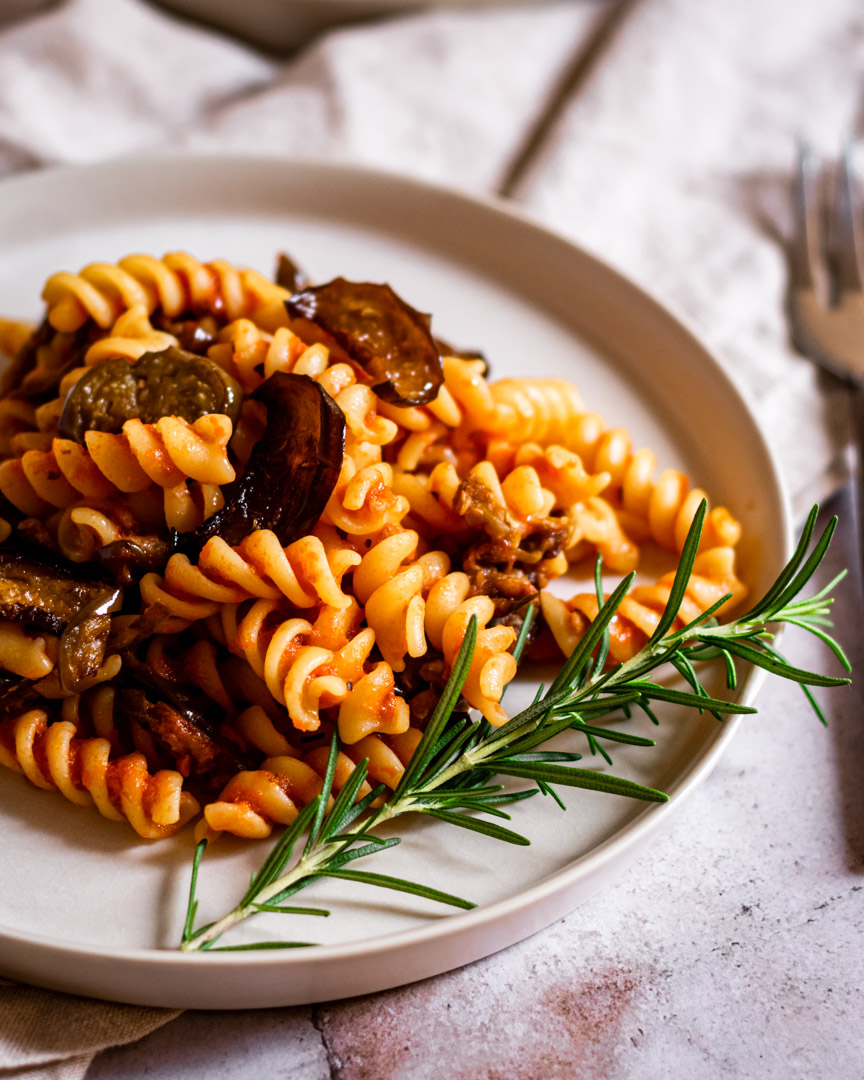 Step 4 – Once the pasta is cooked, set aside a few ladles of pasta water, drain the pasta and place it back into the pan. Add the tomato sauce and toss it on a low heat to combine – you can add some of the pasta water if you feel the consistency is getting too dry. Add the aubergines, leaving some aside for garnishing, and toss again to combine.